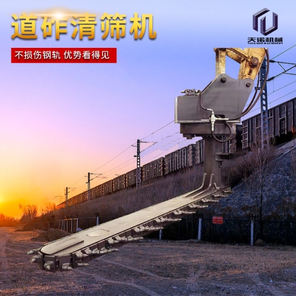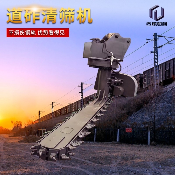 目前,鐵路交通發(fā)展迅速,對(duì)于年久的鐵路路基下面的石子需要定期更換,對(duì)于鐵路上的清渣機(jī)需要大型設(shè)備操作十分的不方面,采用人工又十分耗時(shí),工作效率比較低下;為解決上述問(wèn)題,克服現(xiàn)有技術(shù)的不足,天諾工程機(jī)械研發(fā)了一種能夠在狹小空間內(nèi)作業(yè)、操作簡(jiǎn)單、效果高的鐵路清渣機(jī);鐵路清渣機(jī)包含扒渣鏈部、清渣板部、安裝部和連接部,安裝部設(shè)置在扒渣鏈部的上部,其用于與挖掘機(jī)連接;清渣板部設(shè)置在扒渣鏈部的尾端,清渣板部和扒渣鏈部通過(guò)連接部相連;扒渣鏈部包括鏈條,鏈條由若干首尾相連的鏈節(jié)組成,鏈節(jié)包括支座和設(shè)置在支座上的截齒;若干截齒呈波浪式陣列布置;安裝部包括上座板和下座板,上座板和下座板之間設(shè)置有回轉(zhuǎn)支承,上座板上部設(shè)置有兩個(gè)相互平行的大耳板。鐵路清渣機(jī)是為鐵路道咋清理而設(shè)計(jì)的一款鐵路專(zhuān)用屬具,鏈條式道咋清理機(jī)需安裝在150挖掘機(jī)前端,并從軌道外側(cè)位置清理,通過(guò)大扭矩馬達(dá)帶動(dòng)免維護(hù)鏈條上作業(yè)鏈條上裝置超耐磨的合金屬具對(duì)道床道砟進(jìn)行連續(xù)清理的技術(shù),排列使得道砟的清理及更換更加簡(jiǎn)單高 效,提高了施工速度同時(shí)節(jié)省了勞動(dòng)力。